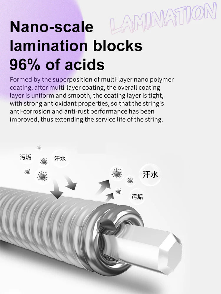 Formed by the superposition of multi-layer nano polymer coating, after multi-layer coating, the overall coating layer is uniform and smooth, the coating layer is tight, with strong antioxidant properties, so that the string's
